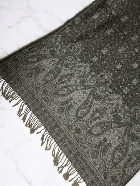 Threadwork Paisley Pashmina Shawl - Matcha Grey White