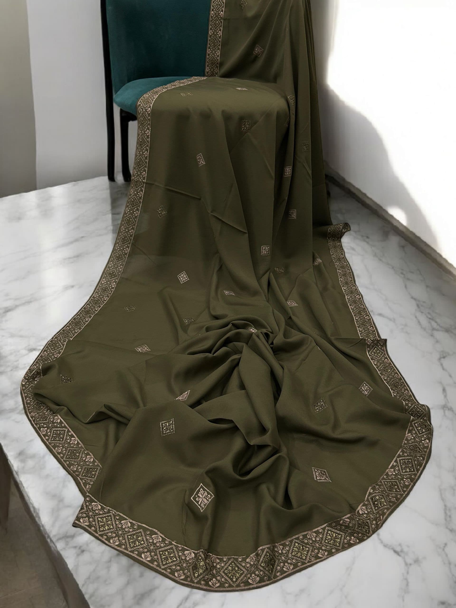 Olive Pink Squares Threadwork Embroidered Border Shaal