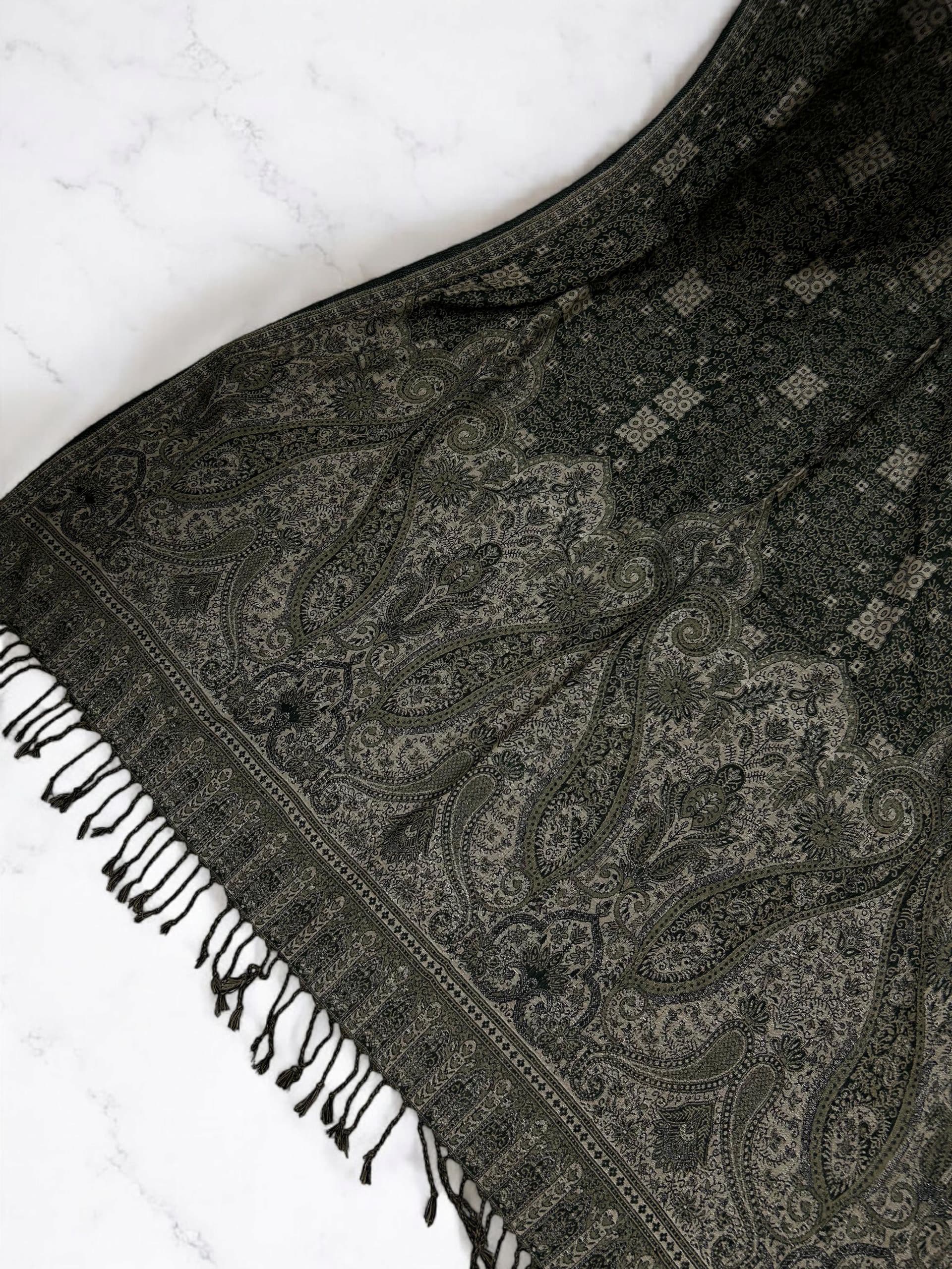 Threadwork Paisley Pashmina Shawl - Army Green Beige
